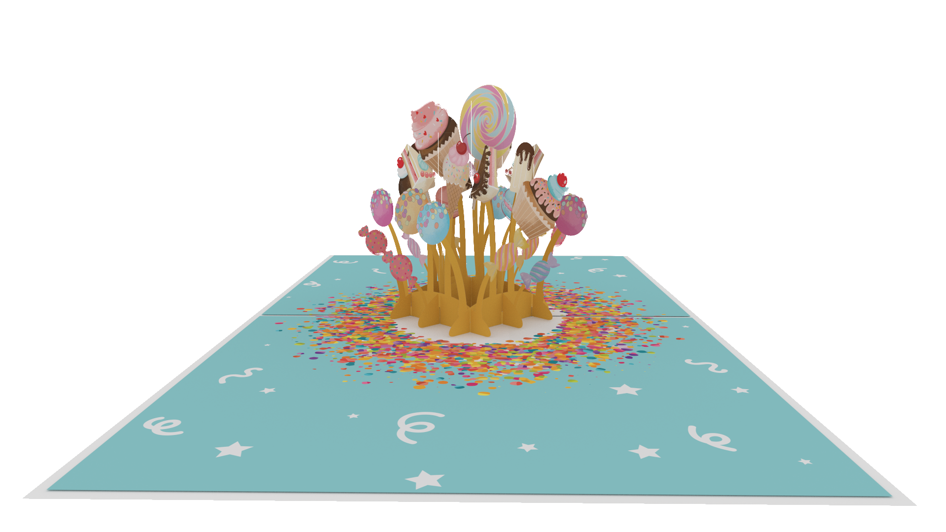 Description: The 5.5” x 6.7’’ 3D pop-up Birthday Sweet card is a delightful and unique way to celebrate birthdays. This card features an explosion of sweets, including cakes, candy, cupcakes, donuts, and more, expertly crafted in an intricate pop-up centerpiece.