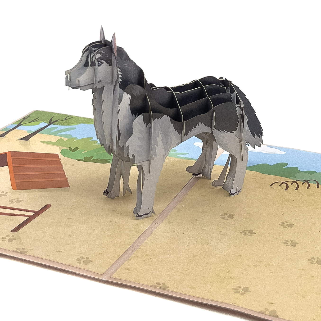 Dog Breed: The Siberian Husky dog on the pop-up is portrayed in a realistic and charming manner, capturing the breed's striking appearance and friendly nature. The park scene adds a touch of natural beauty to the card, making it a perfect gift for animal lovers.
