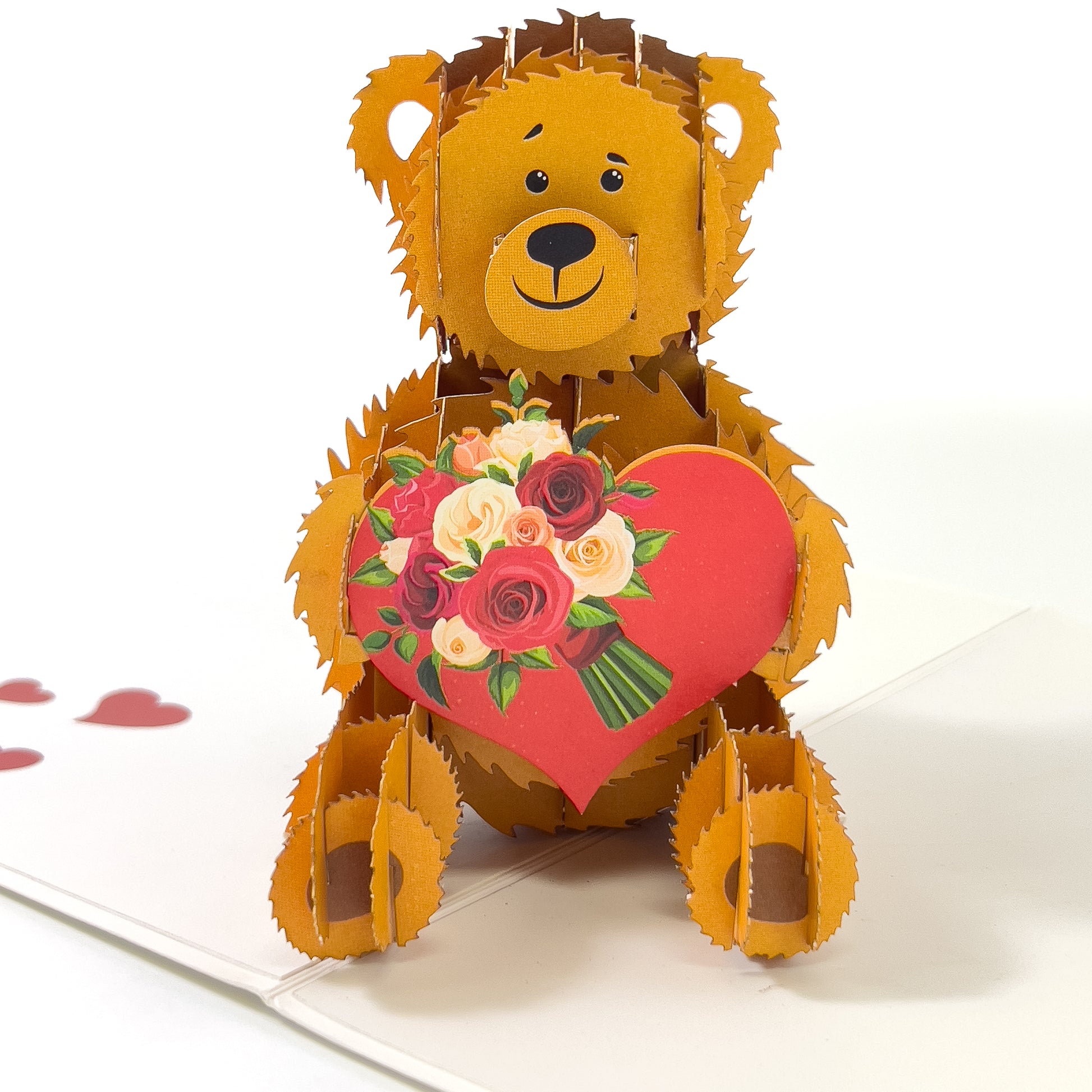 The pop-up is exquisitely crafted, with intricate details that create a lifelike and three-dimensional effect. The teddy bear is adorned with delicate decorations and has a sweet expression on its face, making it a perfect symbol of love and affection. The heart it's holding is embellished with hearts and flowers, adding to the romantic atmosphere of the design. The background of the card is a soft white color, which provides a gentle contrast to the bold colors of the pop-up centerpiece. This "Love Bear" card is perfect for celebrating a romantic occasion, such as Valentine's Day, an anniversary, or a proposal, or simply to share your love with someone special.