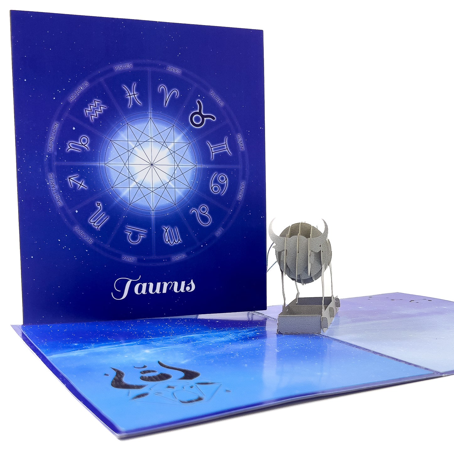Description: This 5.5" x 6.7" 3D pop-up Taurus zodiac card features a beautifully crafted pop-up centerpiece that depicts the iconic Taurus symbol and other zodiac-related elements. It is a unique and thoughtful way to celebrate and acknowledge someone born under the Taurus zodiac sign. The Taurus zodiac sign is often associated with traits such as being reliable, patient, practical, and stubborn.
